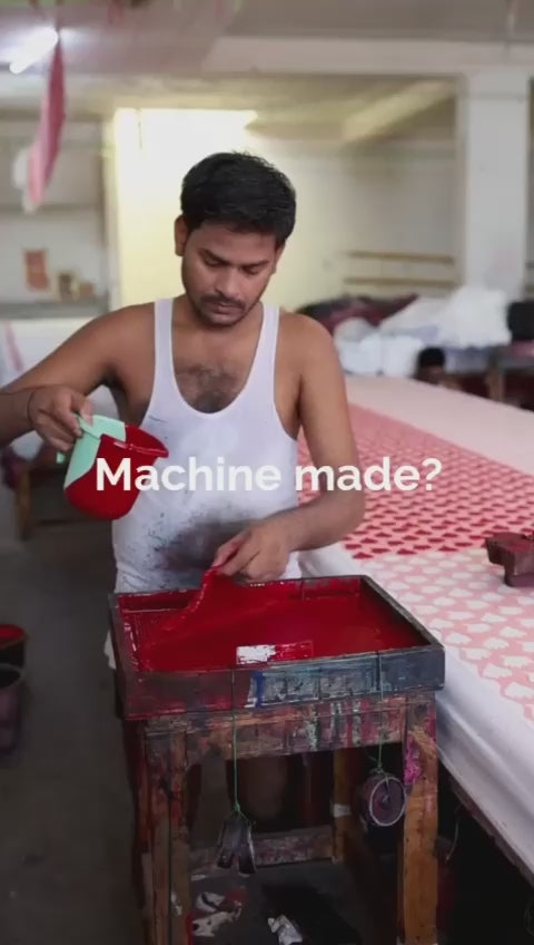 We use 100% cotton fabrics made using traditional techniques like hand block printing and hand weaving.