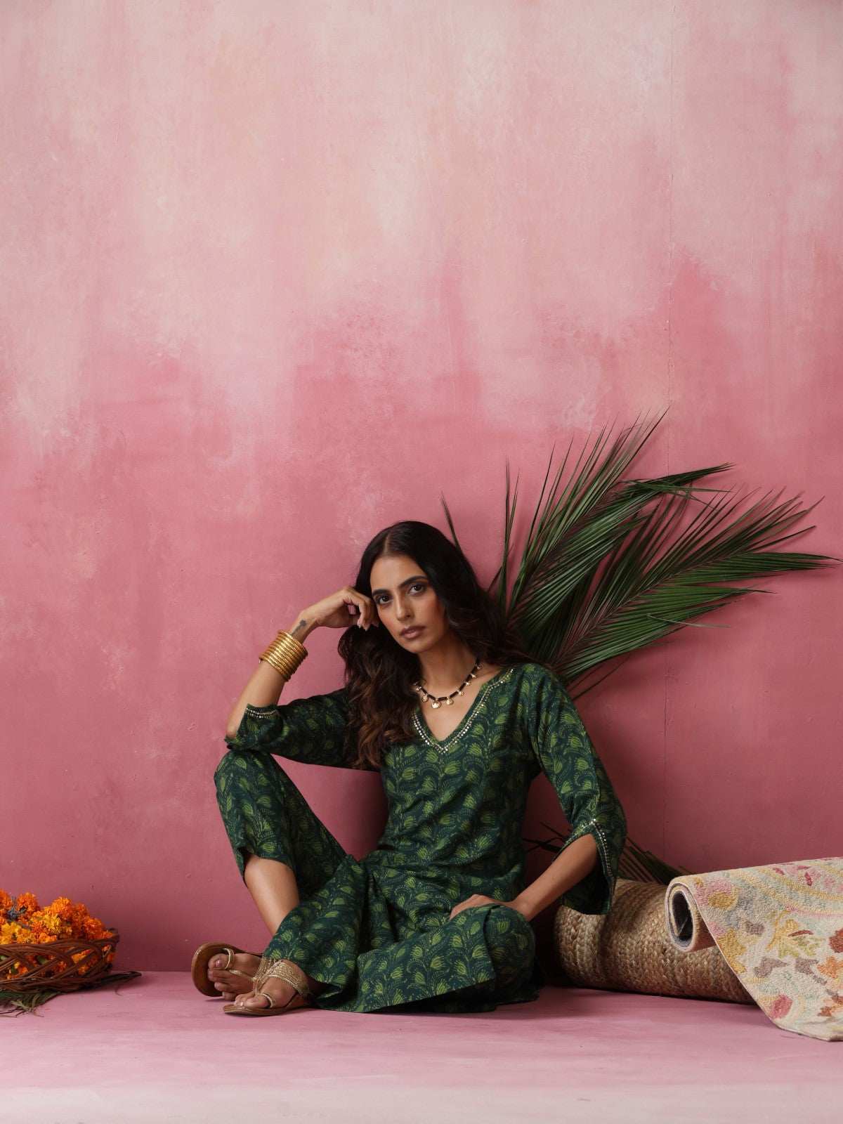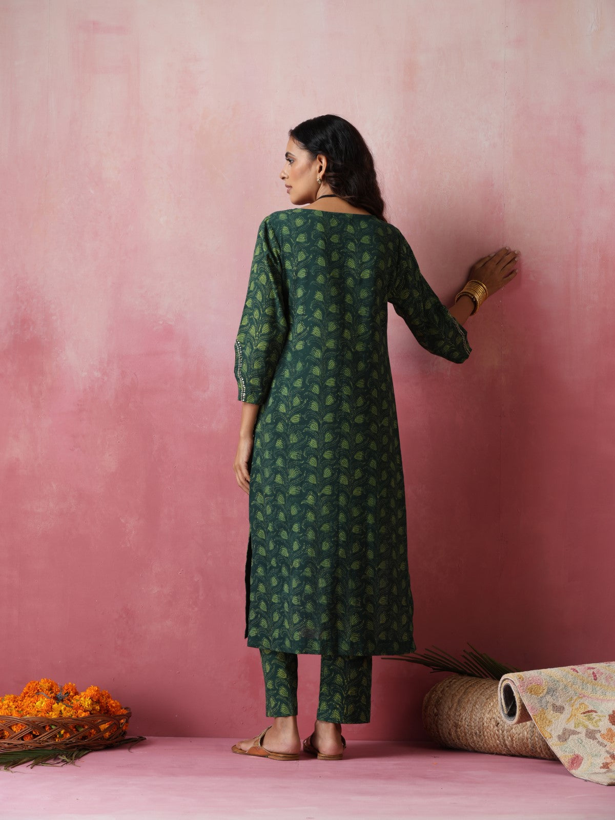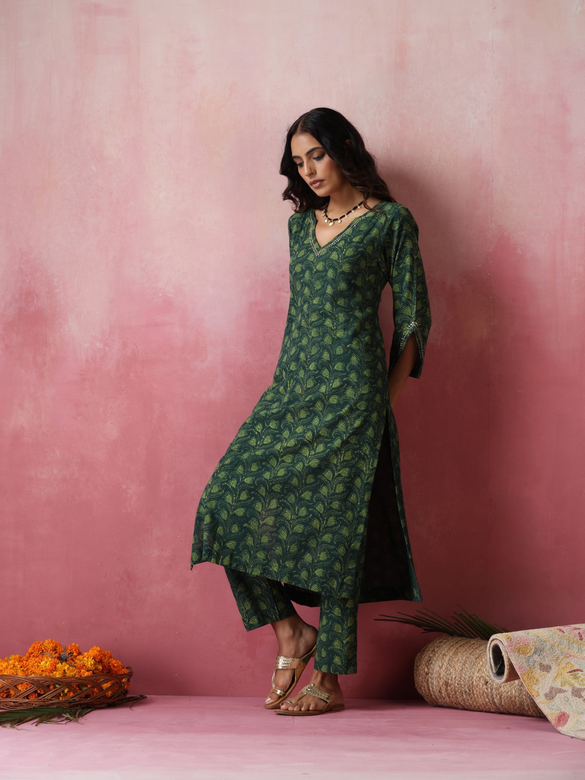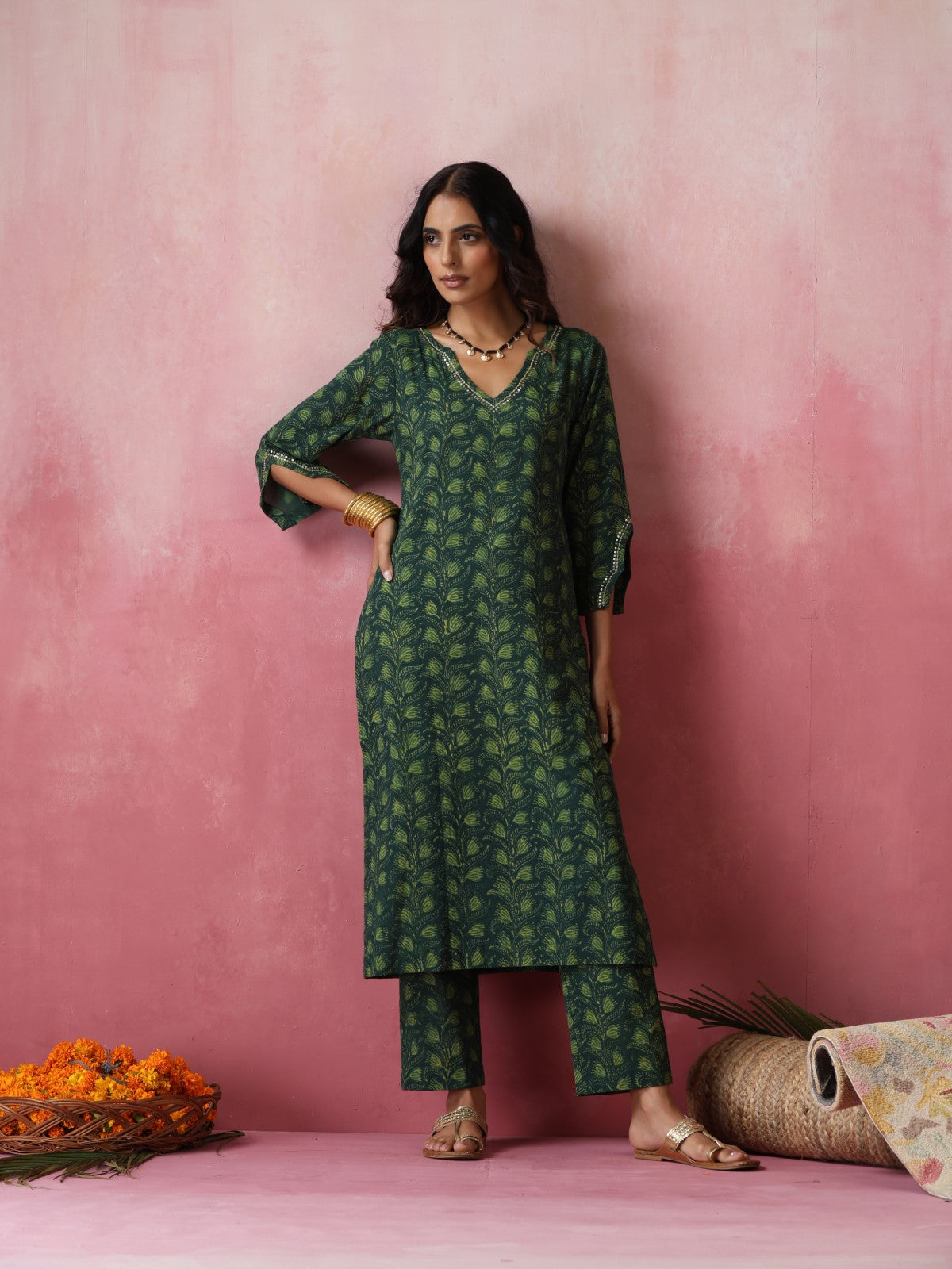 Chandan is a straight kurta set made in beautiful shades of green. It features gorgeous hand embroidery on neckline with golden sequins and cutdana. The sleeves have an interesting outline enhanced with same golden hand embroidery. Paired with a matching pant