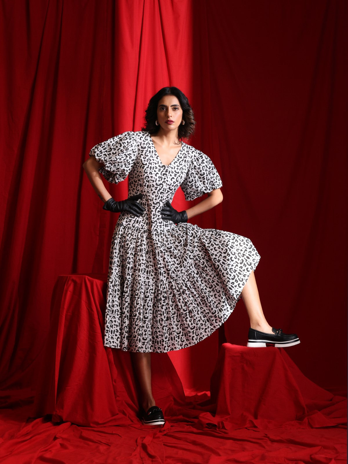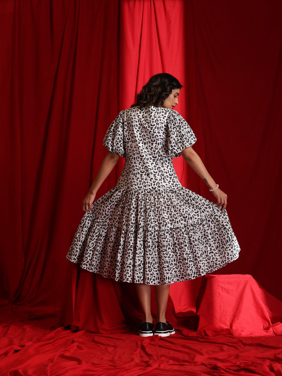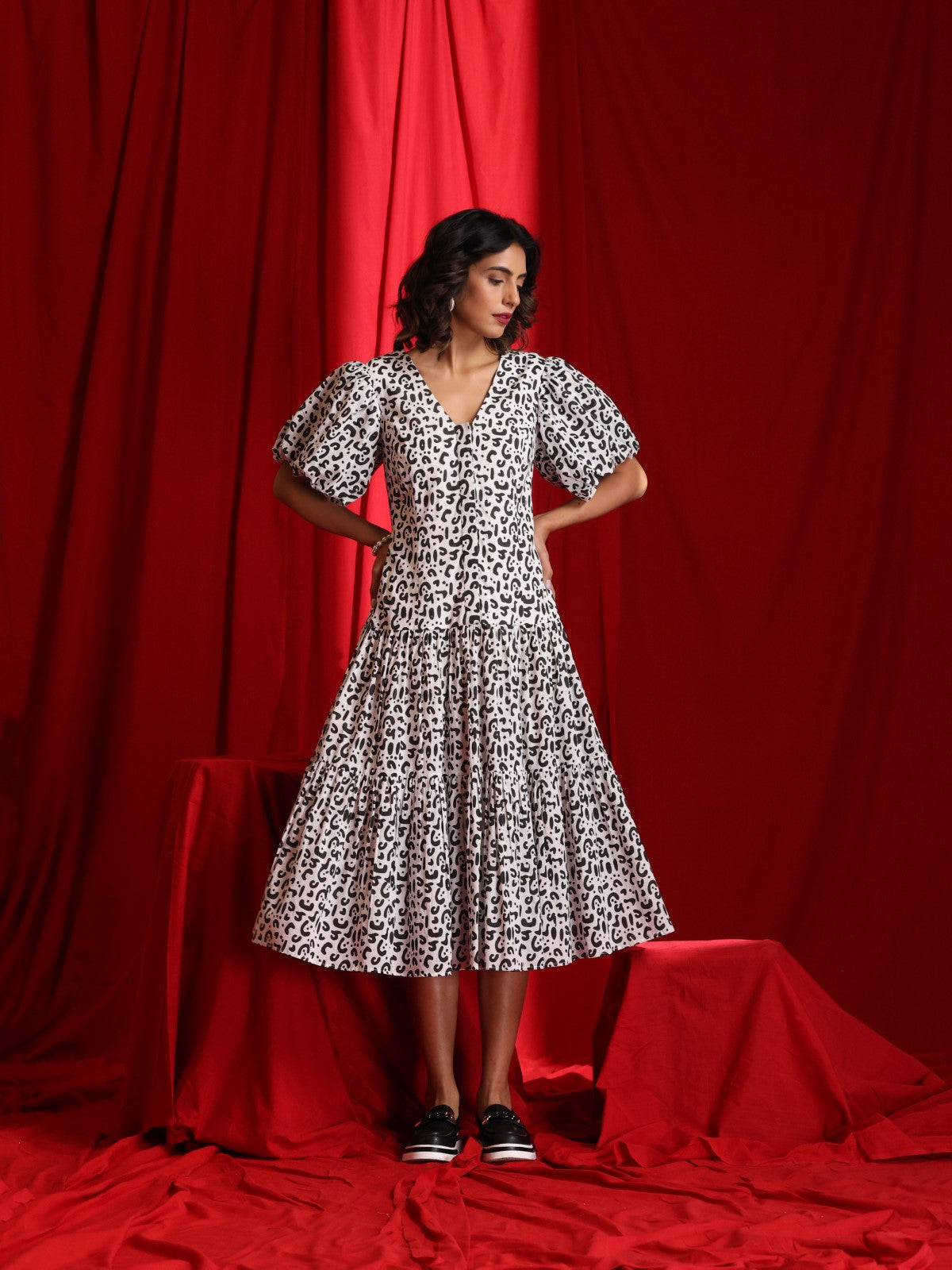 A fun dress crafted in abstract print with a drop waist and fabulous, dramatic sleeves. The tiered style adds to the flair and volume. The placket has hidden buttons in a contrasting red color adding to the drama. This dress falls and fits beautifully flattering all body types.