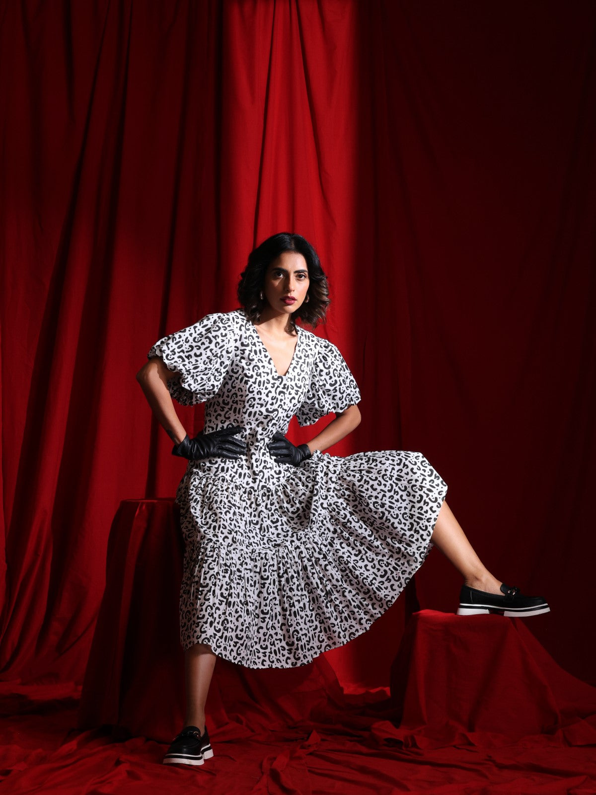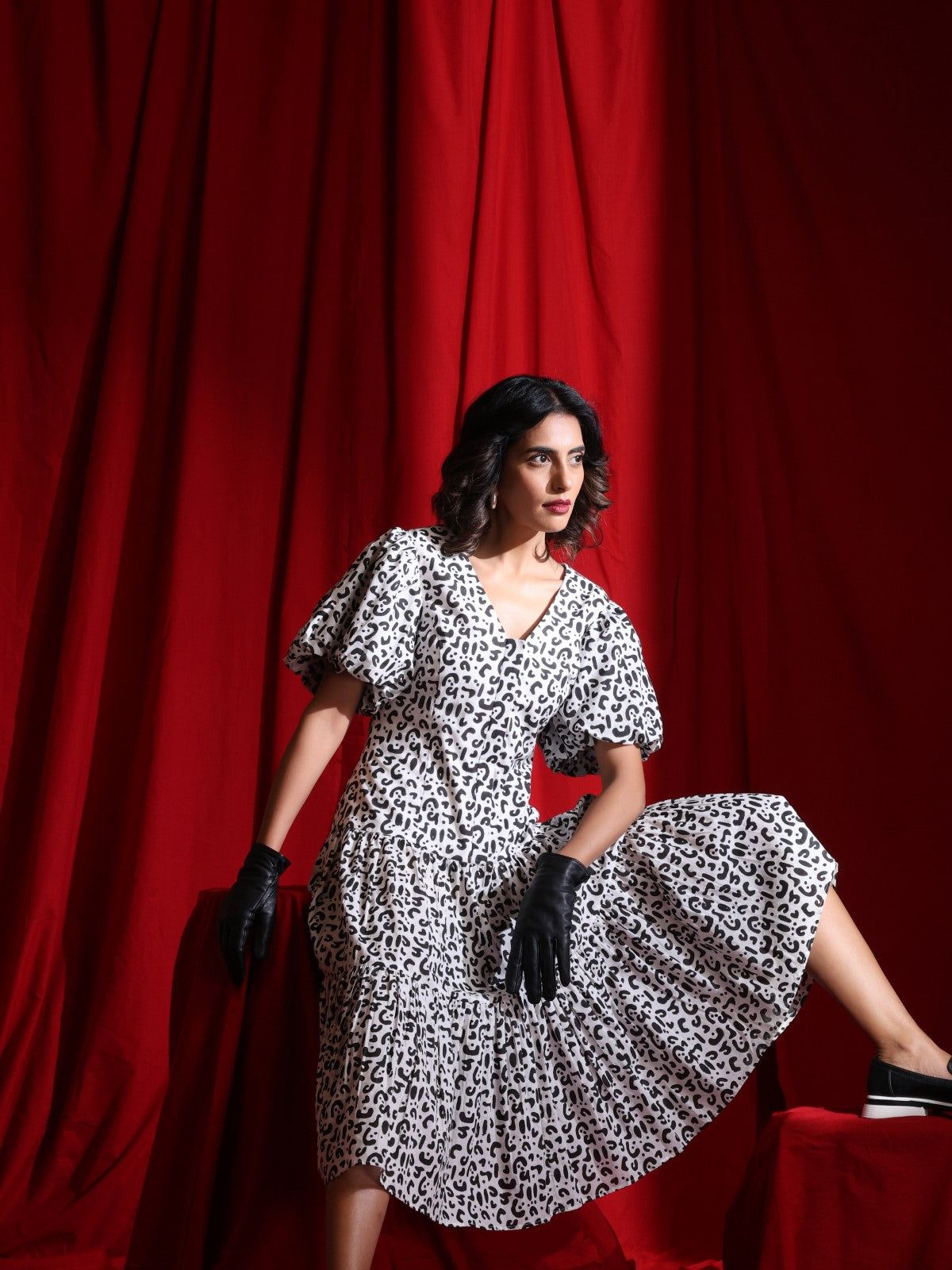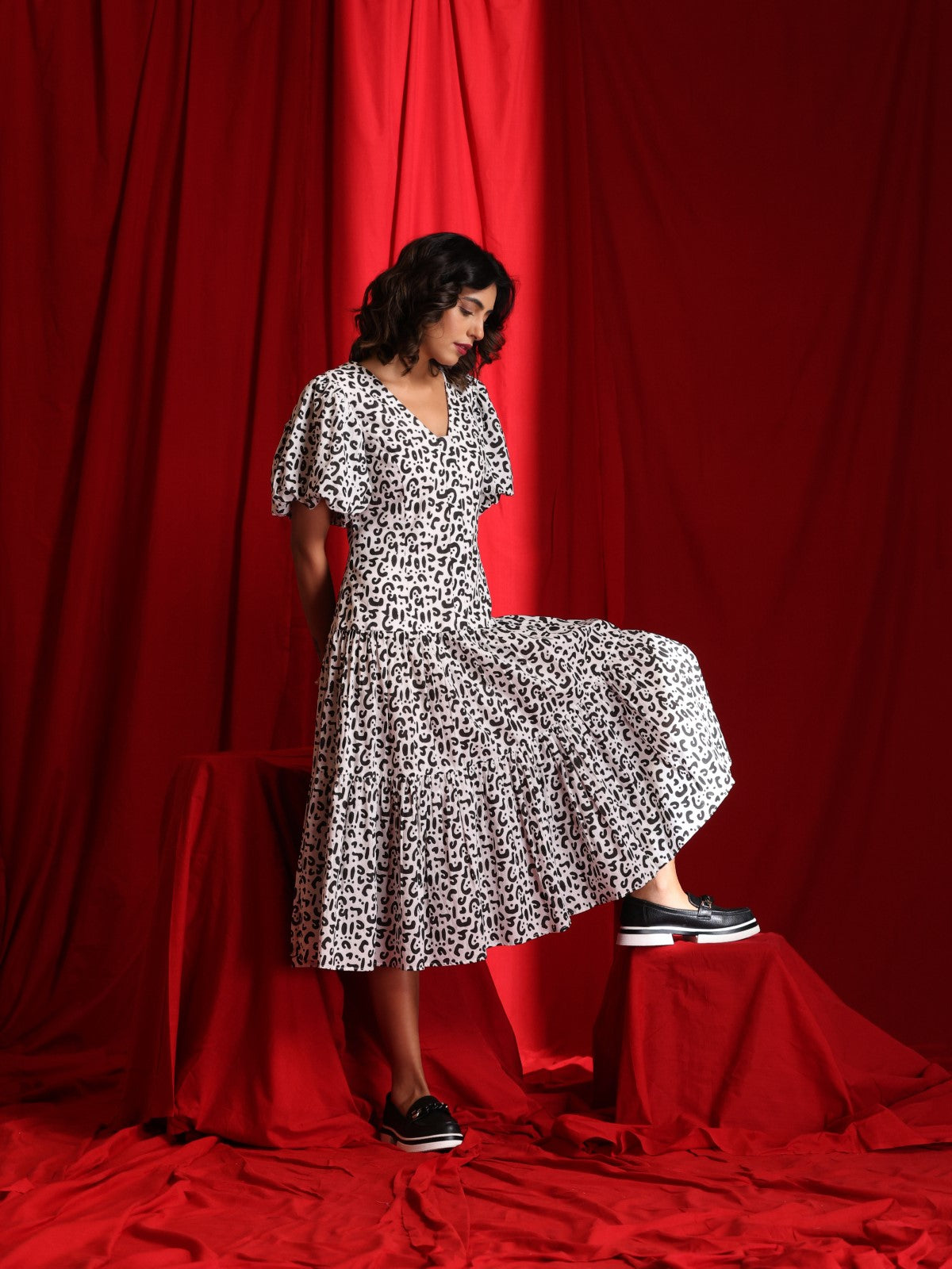 A fun dress crafted in abstract print with a drop waist and fabulous, dramatic sleeves. The tiered style adds to the flair and volume. The placket has hidden buttons in a contrasting red color adding to the drama. This dress falls and fits beautifully flattering all body types.