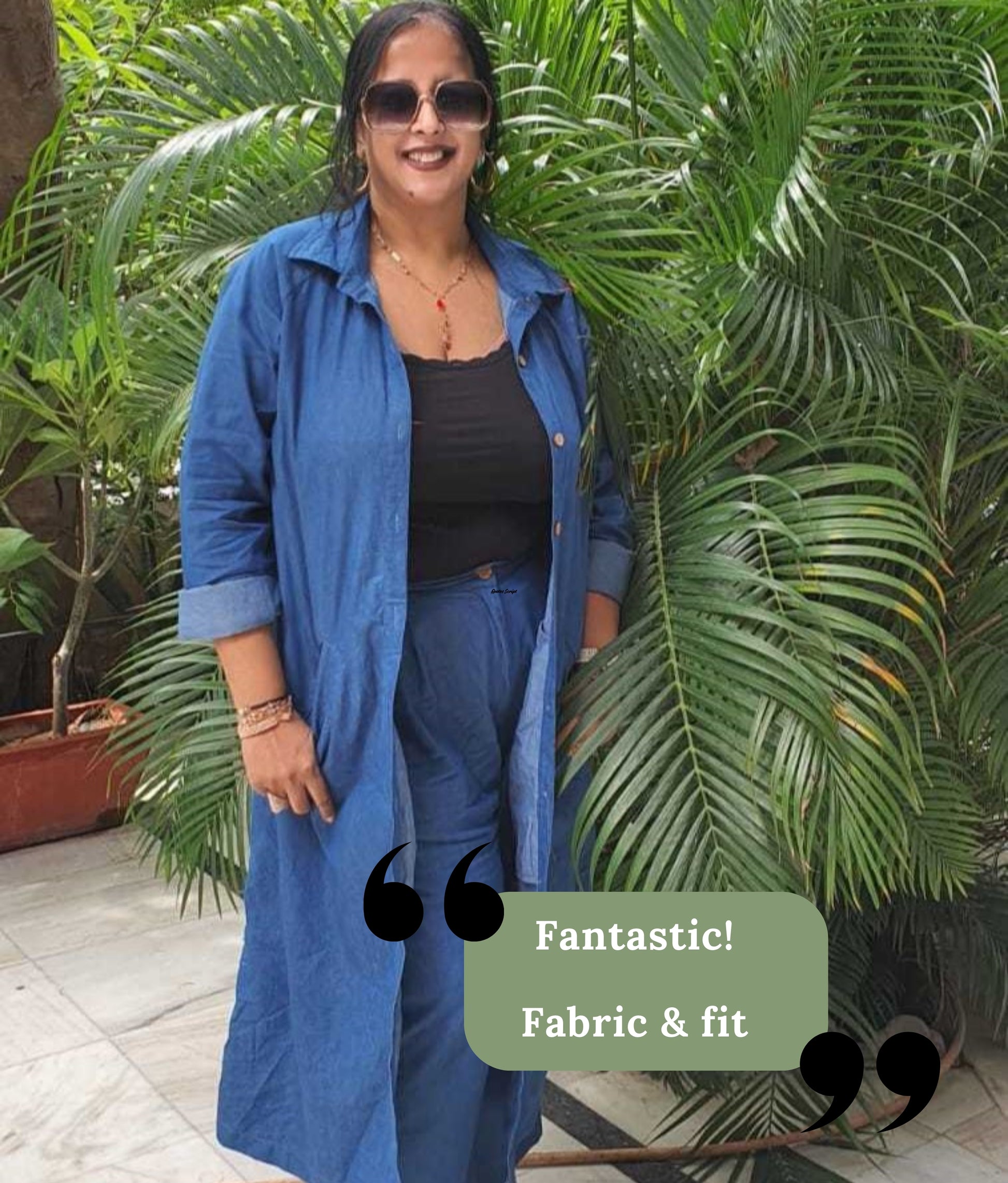 Featuring a versatile long oversized shirtdress/jacket/overlay crafted in lightweight cotton denim fabric paired with slightly wide pleated trousers. Both of these pieces are classic and will always be in trend. Both can be styled in multiple ways making this coord set one of your best investments, and frankly a steal at this price. Take inspiration from our photoshoot of how to style both of these pieces with other garments as both these pieces have been styled together and separately in this collection.
