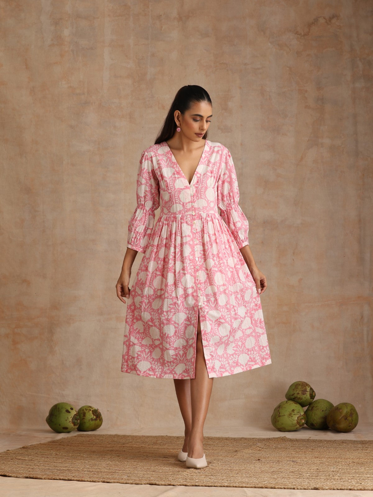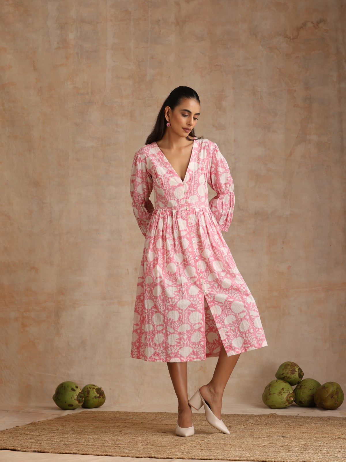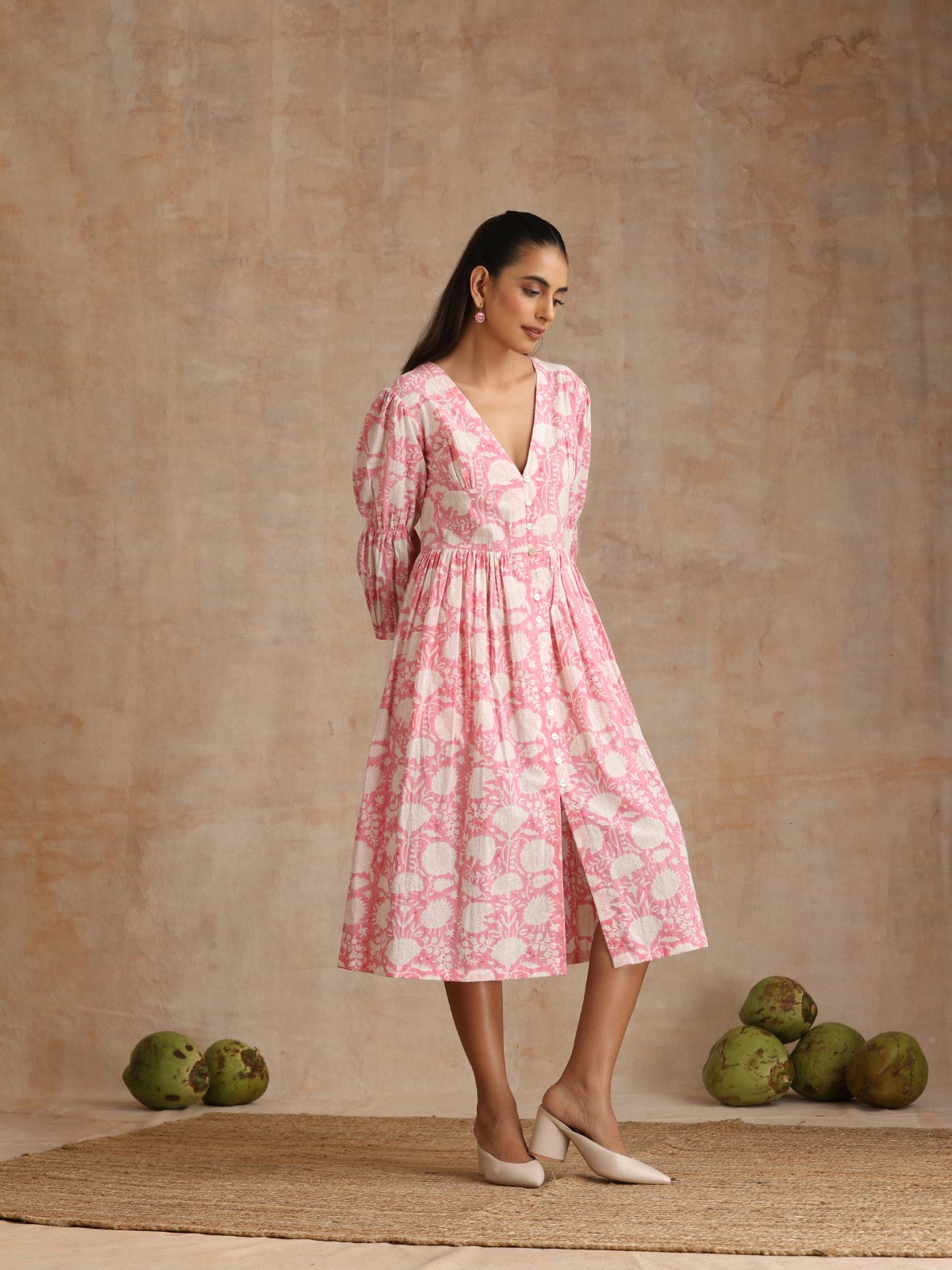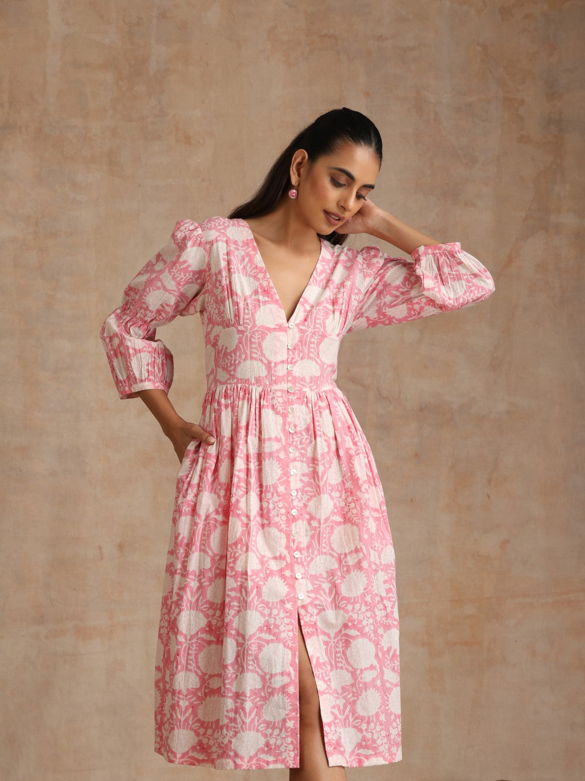 Everything about this dress is so stylish and dreamy. The print is beautiful, the bodice has a stunning cut and a deep neck. The sleeves have a unique ruching element. It can be opened up completely and you can wear this as a jacket/overlay. It can also be worn with straight white pants.