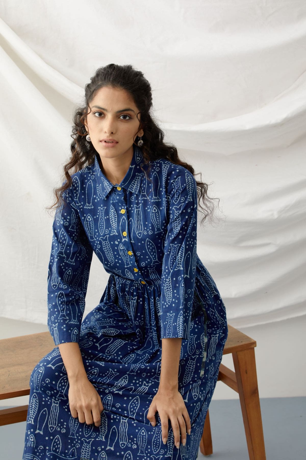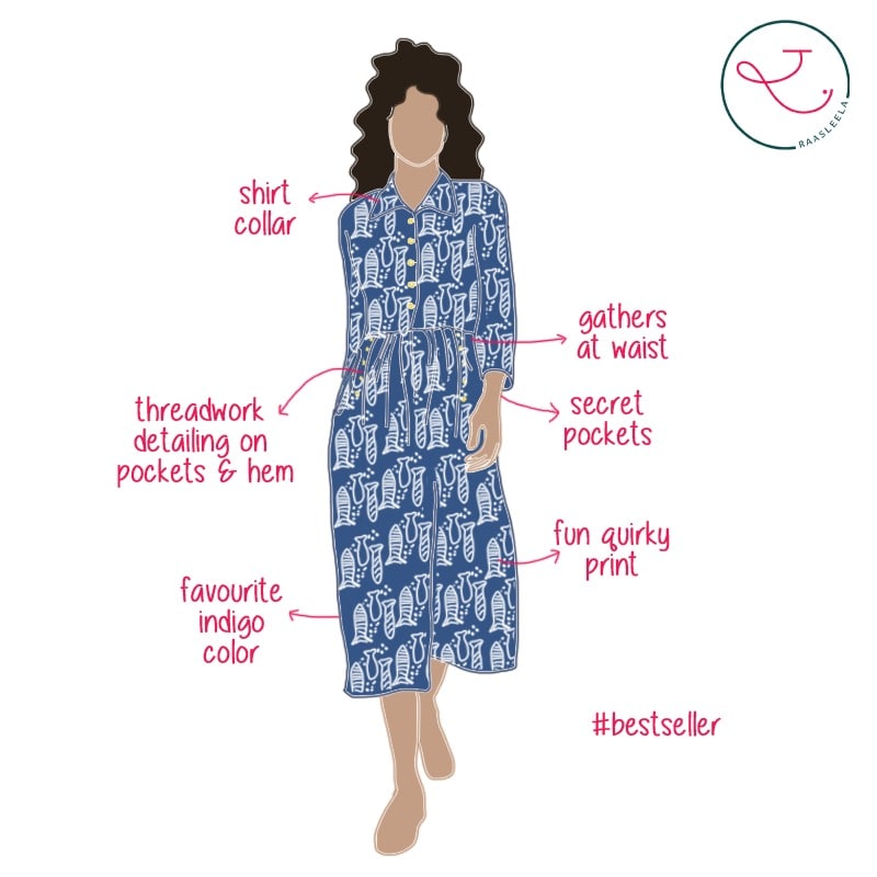 This is one of our bestselling style, relaunched in this fun fish print. This dress will get you so many compliments! Pls note that the hem of the dress features upcycled small indigo fabric patches which we use from textile scraps and that scrap design may vary. This however does not impact the look of the dress at all.