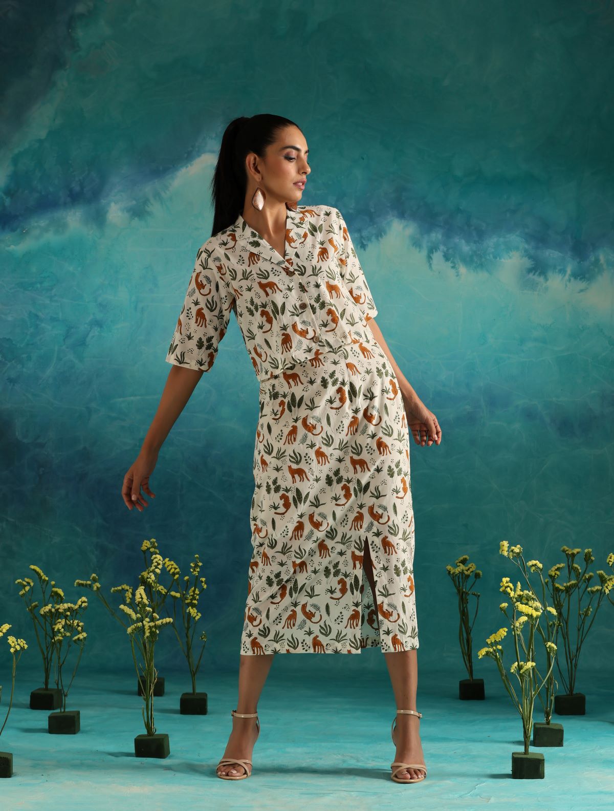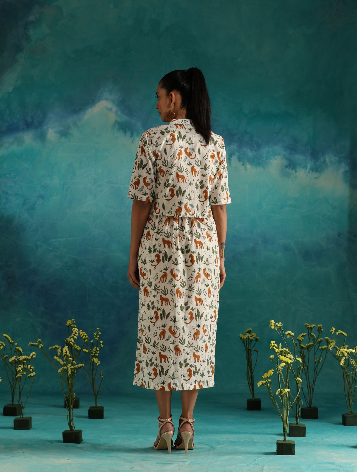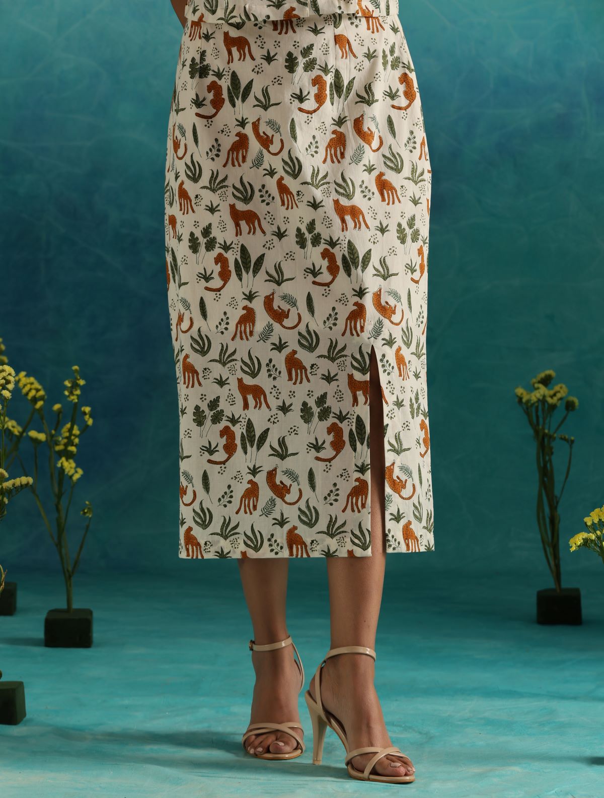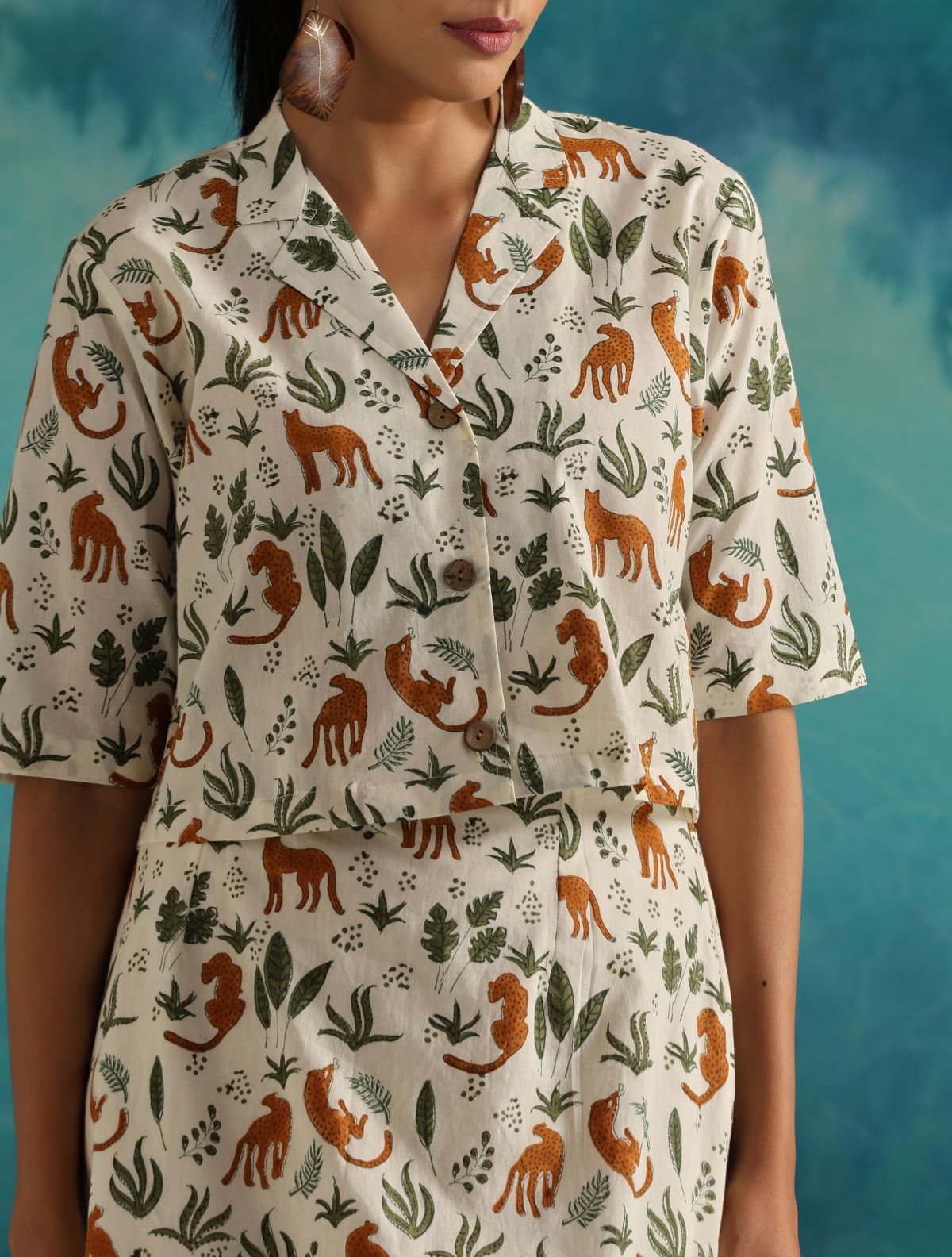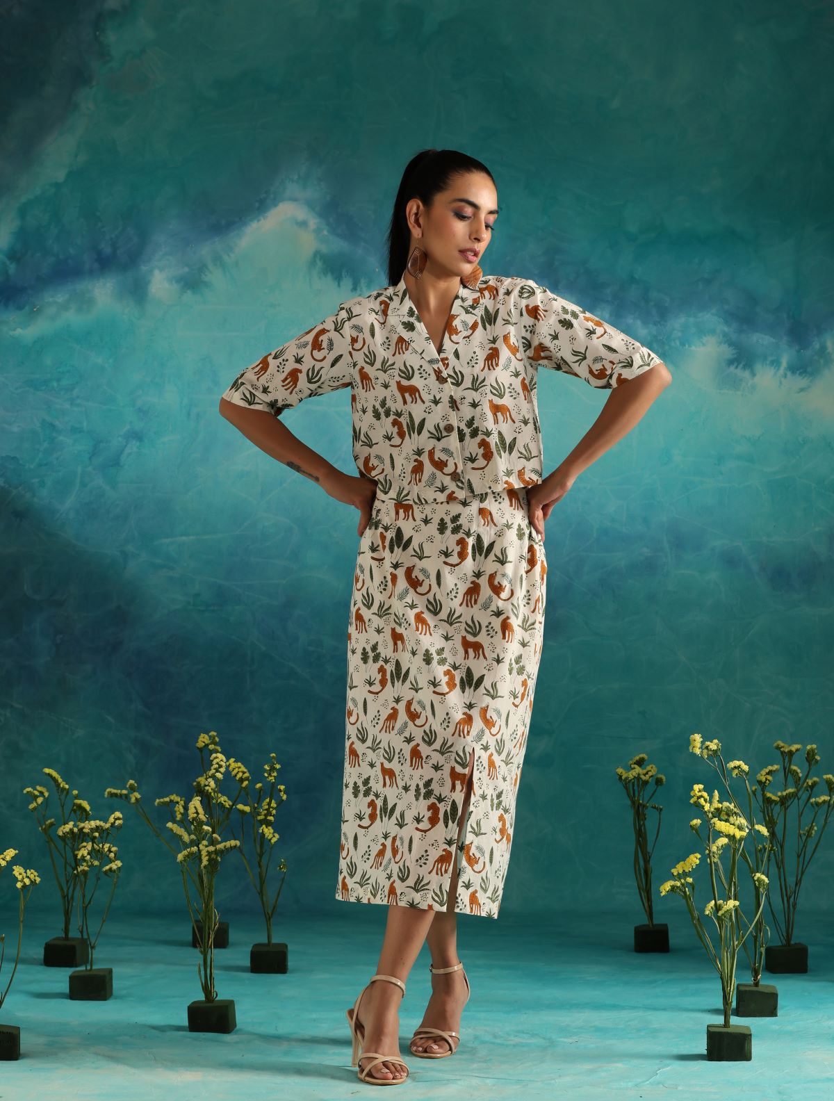 This bestselling set features a crop top with a boxy cut. It has a collar and wooden buttons. Paired with high waisted straight skirt with a small side slit. The print and color combinations are unique and the cut contemporary making it one of the most special outfit in your wardrobe. PLS NOTE THIS IS A CROP TOP/ SHORT LENGTH TOP.
