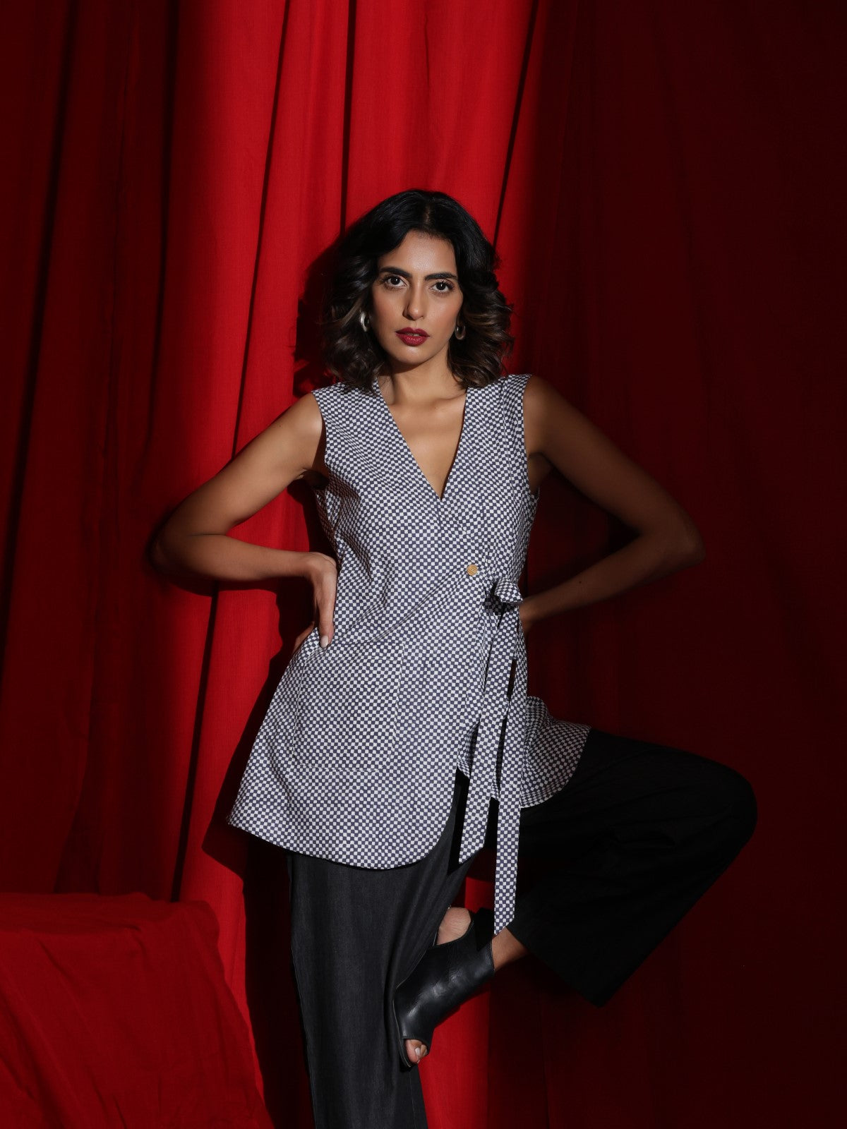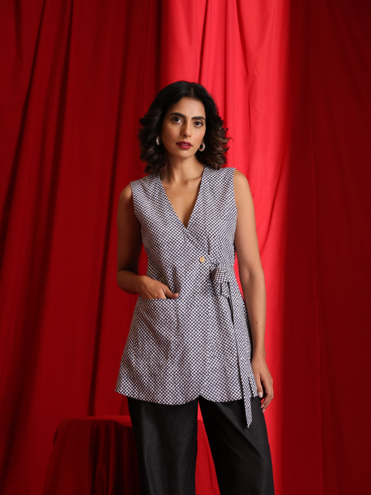 Step into effortless chic with our sleeveless jacket, featuring a V-neckline. The jacket has a hook at the neck and a single wooden button and with a tie detail for a flattering fit. It is made in a classic but always in fashion check pattern There are two patch pockets. This is a casual piece that can be dressed up for occasions. Layered over relaxed trousers or a pleated skirt or even denim shorts, this versatile piece transitions seamlessly from a casual day look to an evening out with friends. Wear it as is or with any solid color tshirt/shirt. It can also be worn over dresses. Complete the ensemble with minimalist accessories for a refined, boho-inspired aesthetic.
