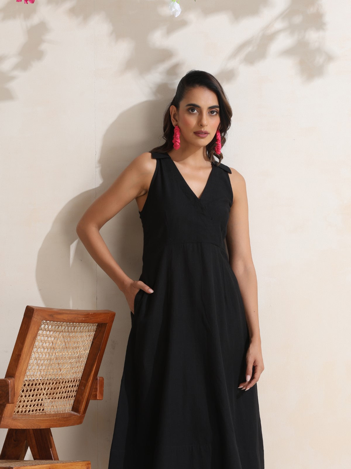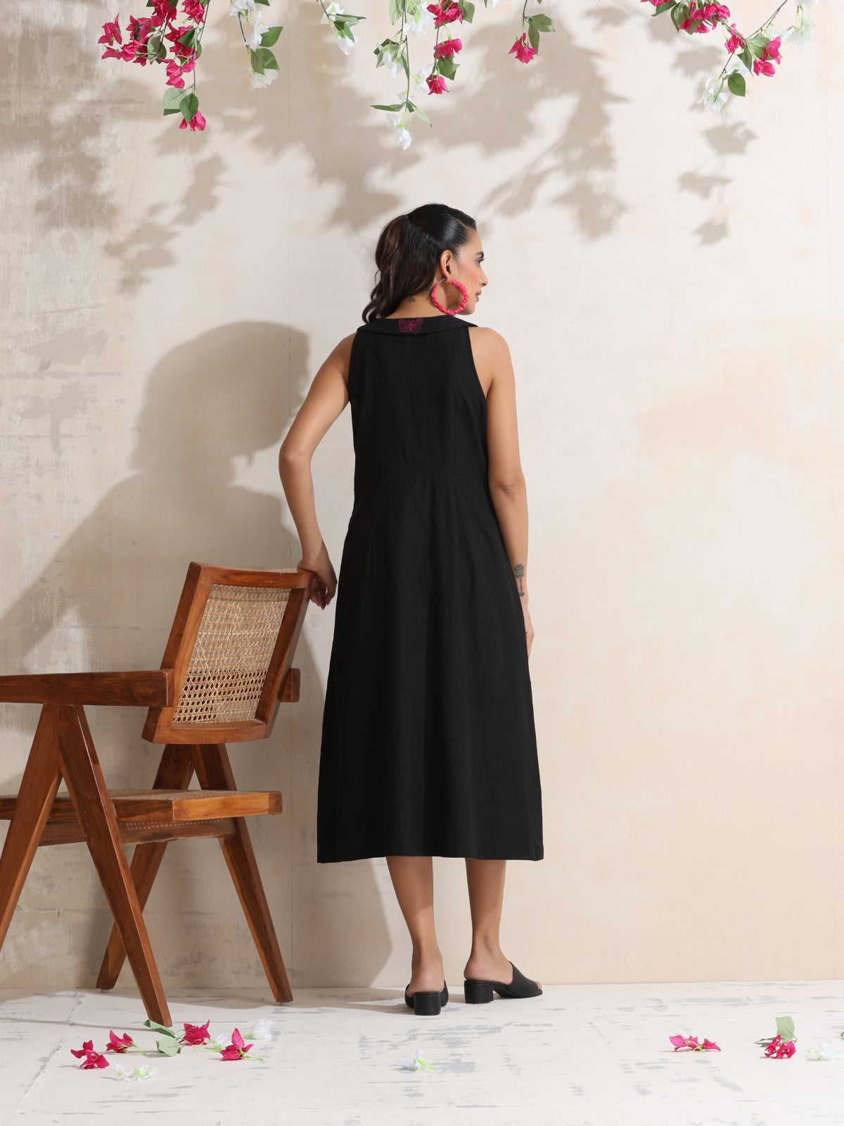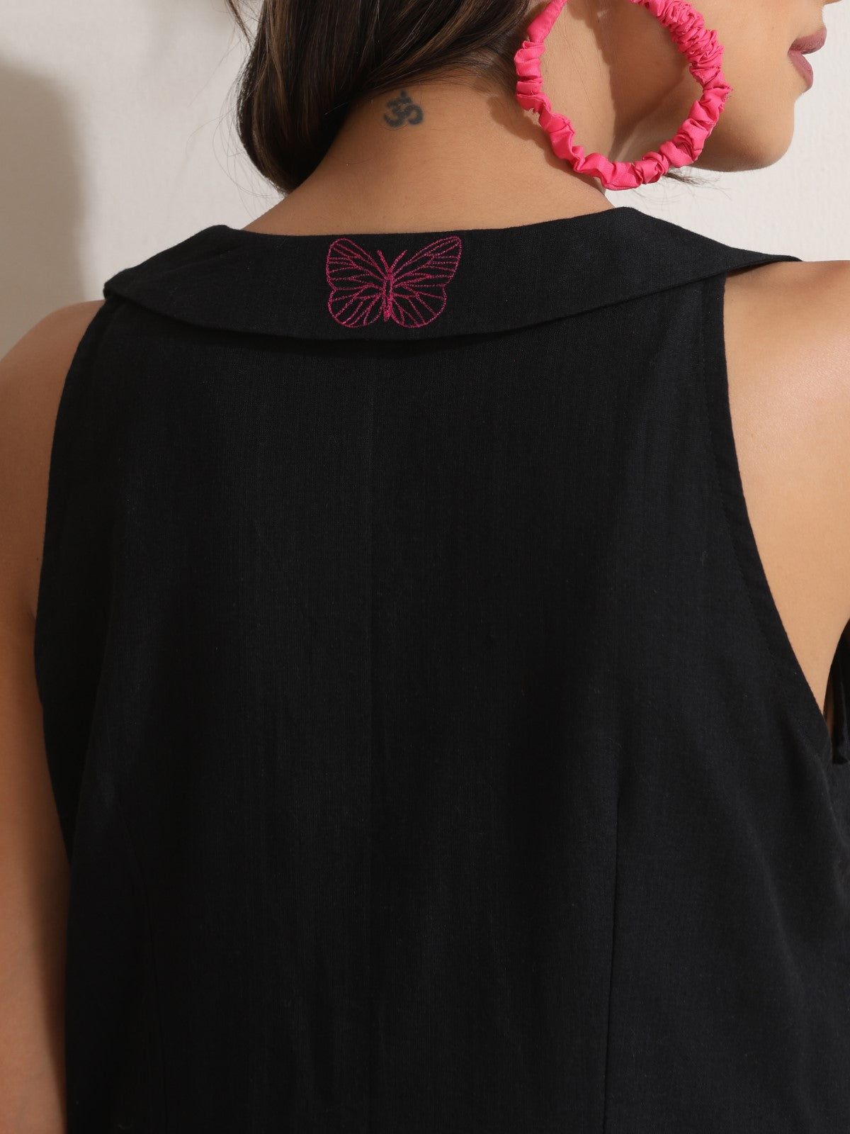 Featuring a halter neck midi dress. It features a collared V neckline and is sleeveless. It’s a stunning dress that can be worn formally in office and for dates. Layer it with a denim jacket for a more street chic vibe and with tailored blazers for formal events. A gorgeous butterfly is embroidered at the back collar, an ode to the collection name.