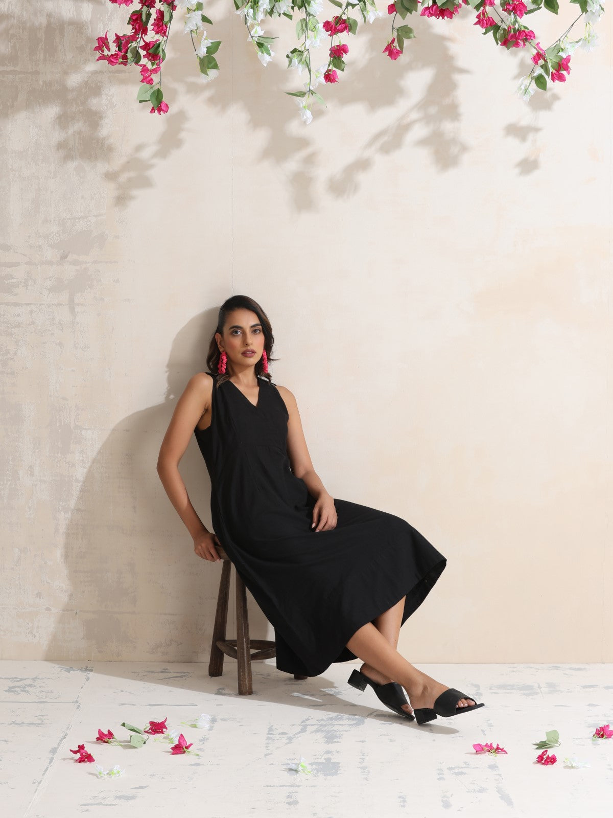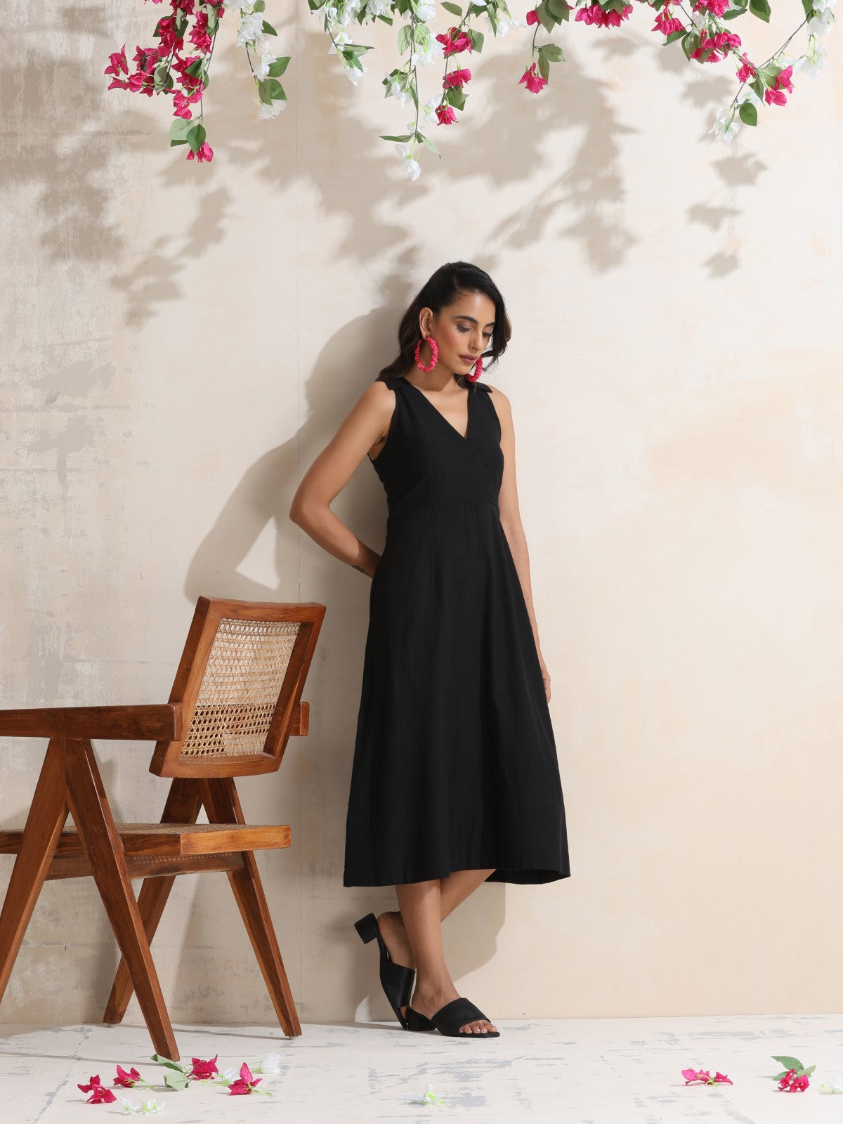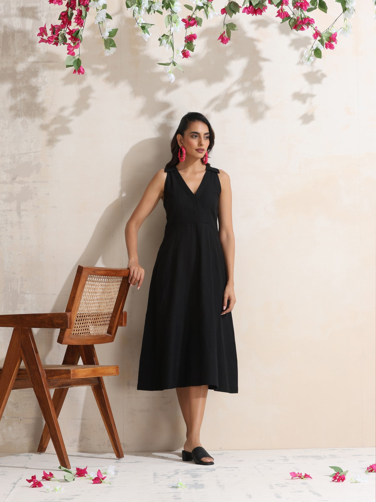 Featuring a halter neck midi dress. It features a collared V neckline and is sleeveless. It’s a stunning dress that can be worn formally in office and for dates. Layer it with a denim jacket for a more street chic vibe and with tailored blazers for formal events. A gorgeous butterfly is embroidered at the back collar, an ode to the collection name.