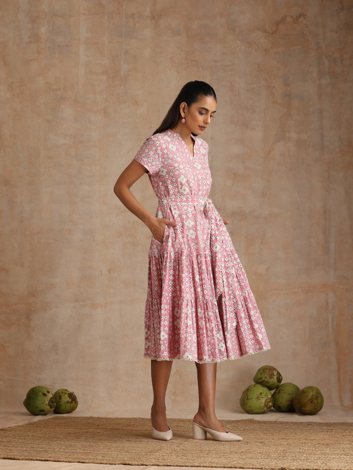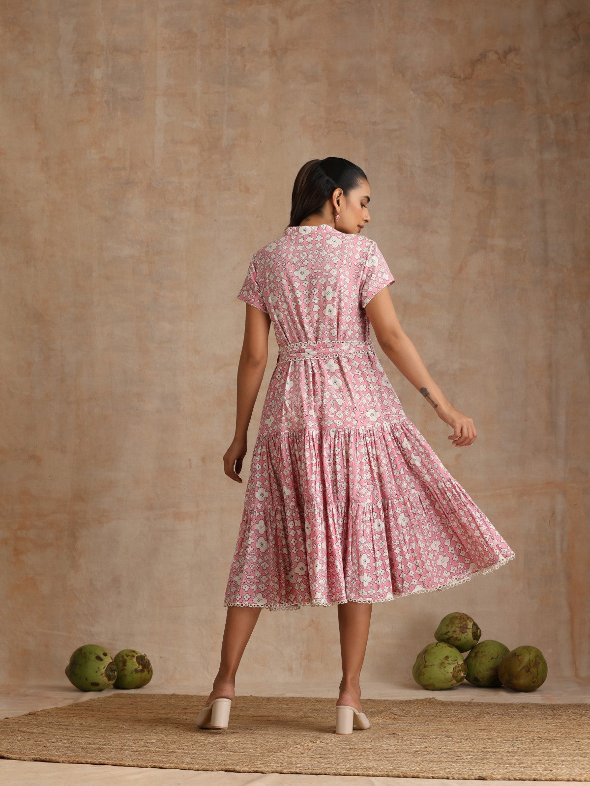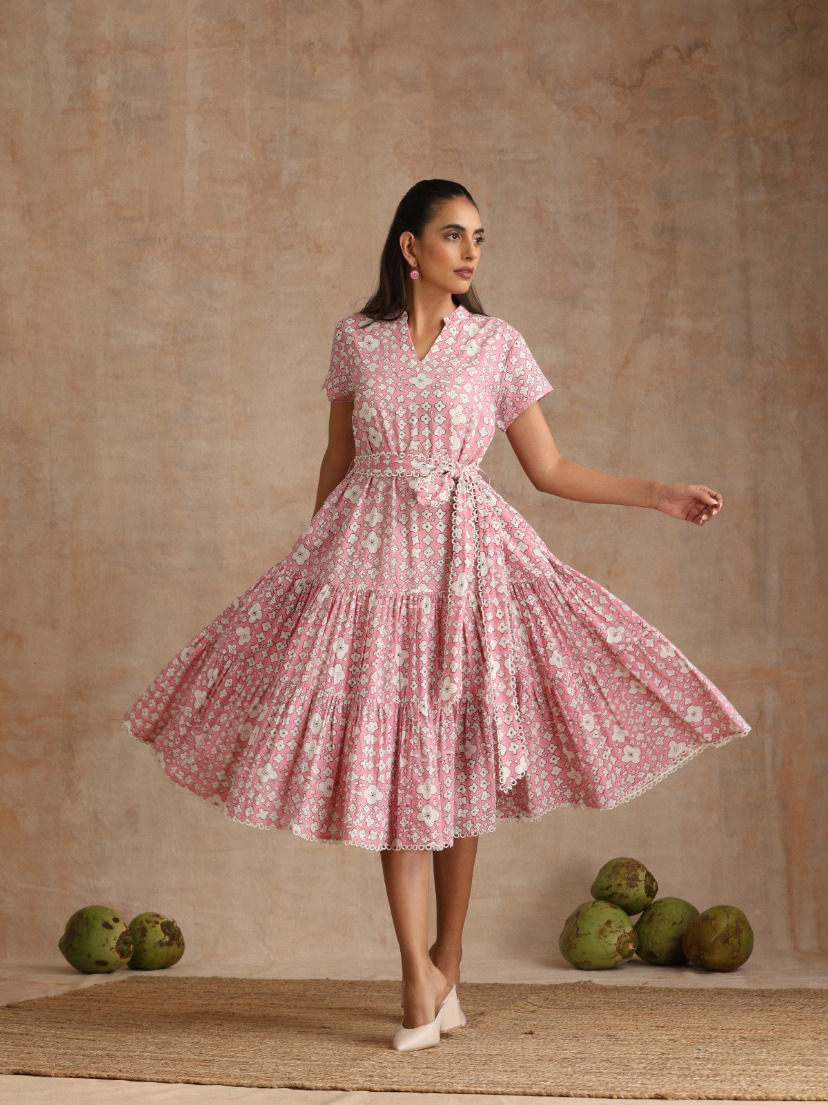 Step into the summers in our pink baubles belted dress. This is a relaxed fun dress with multiple tieres and frills at the hem. The big ghera/flare is made to be so romantic and dreamy, so twirl away!A detachable fabric belt with loopy lace details come with the dress. The same loopy lace also runs throughout the hem of the dress.