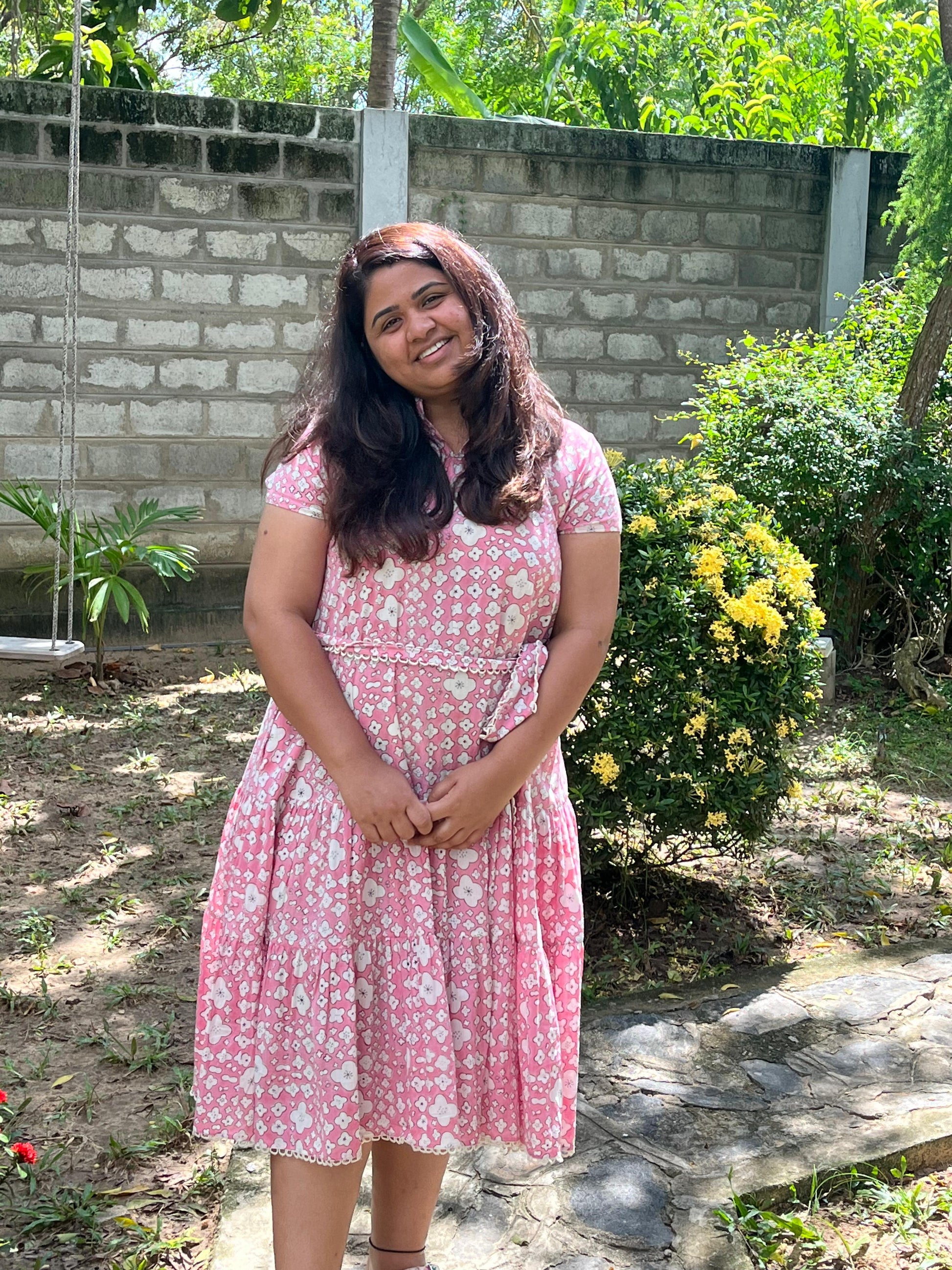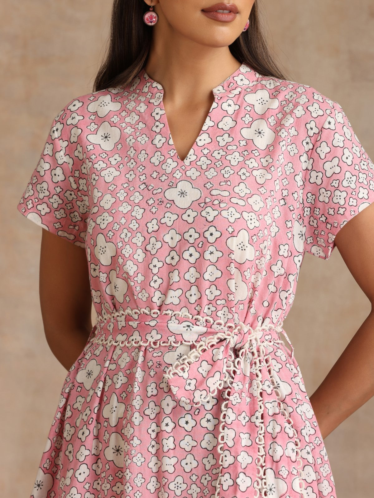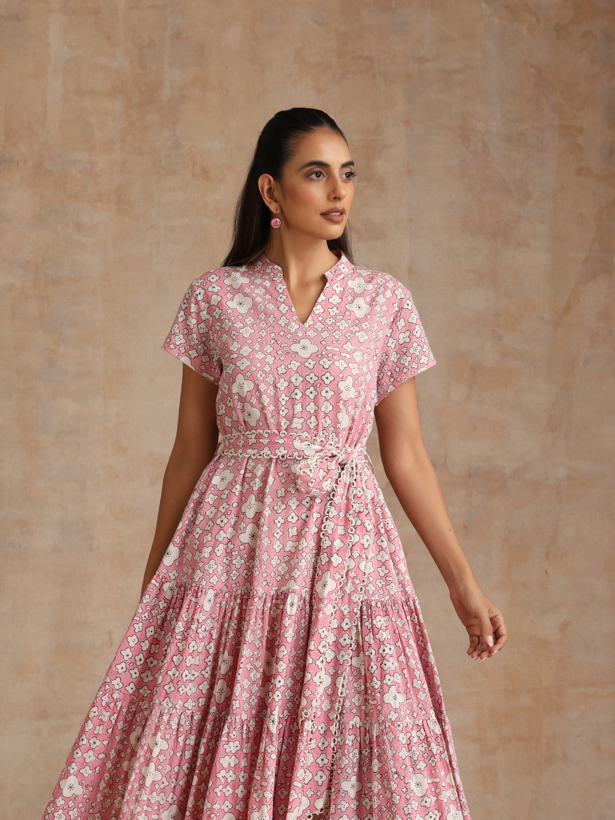 Step into the summers in our pink baubles belted dress. This is a relaxed fun dress with multiple tieres and frills at the hem. The big ghera/flare is made to be so romantic and dreamy, so twirl away!A detachable fabric belt with loopy lace details come with the dress. The same loopy lace also runs throughout the hem of the dress.