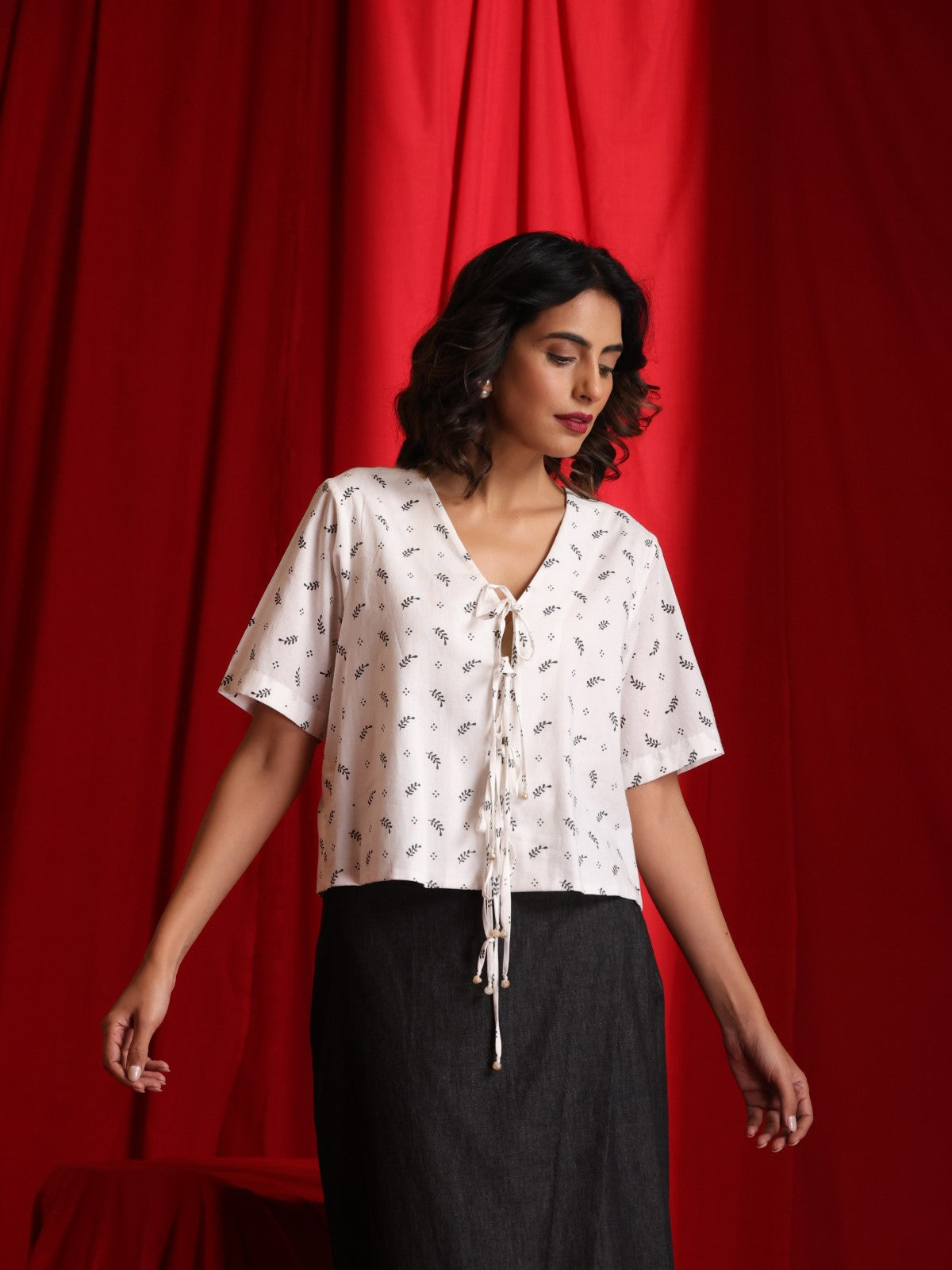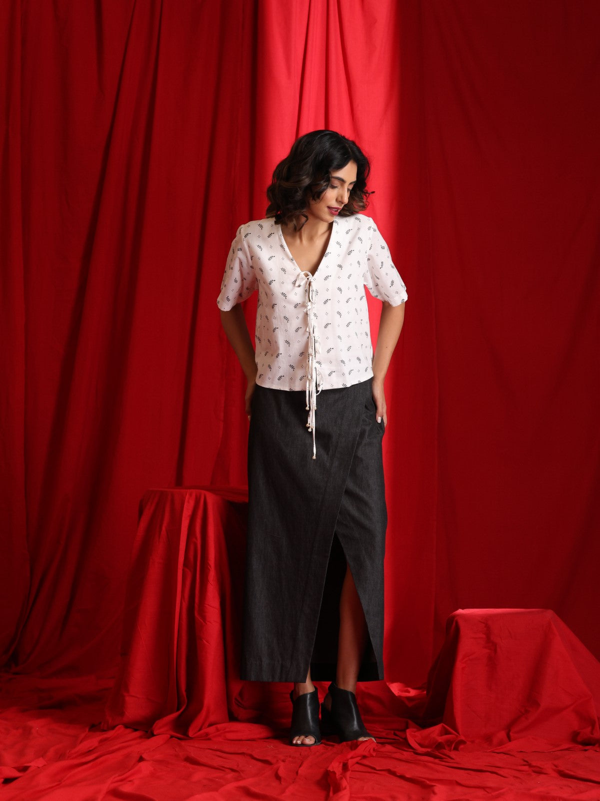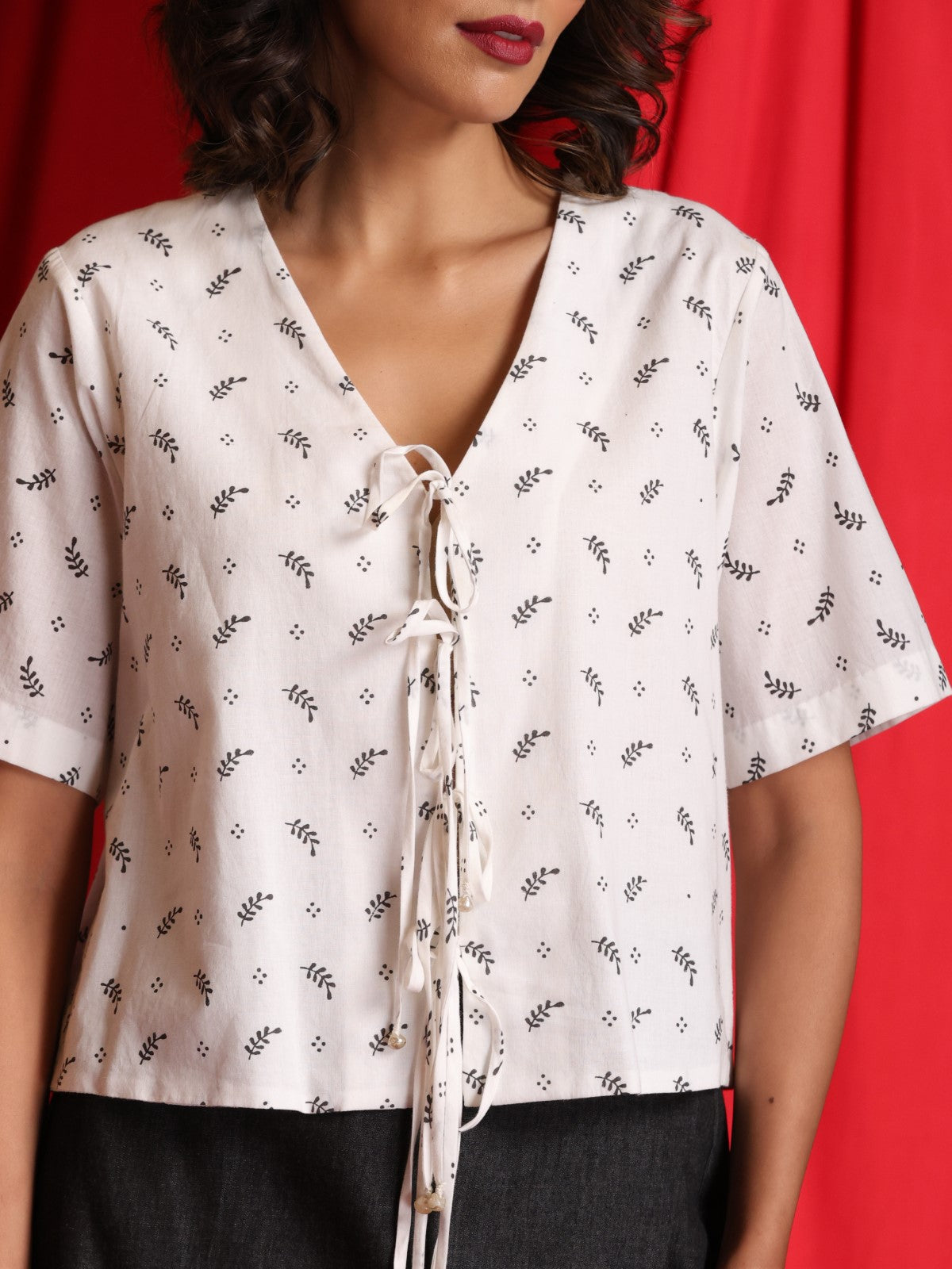 This is the front open top tied with multiple strings at the front which is all the trend and rage currently, The strings are finished with a small pearl button. The top can be worn with all strings opened with a fun inner/vest inside, it can be worn with a few strings closed to give the street chic vibe or with all strings closed for a more comfortable feeling. Pair it with black trousers or with denim shorts or with pleater midi skirt, depending on the occassion.