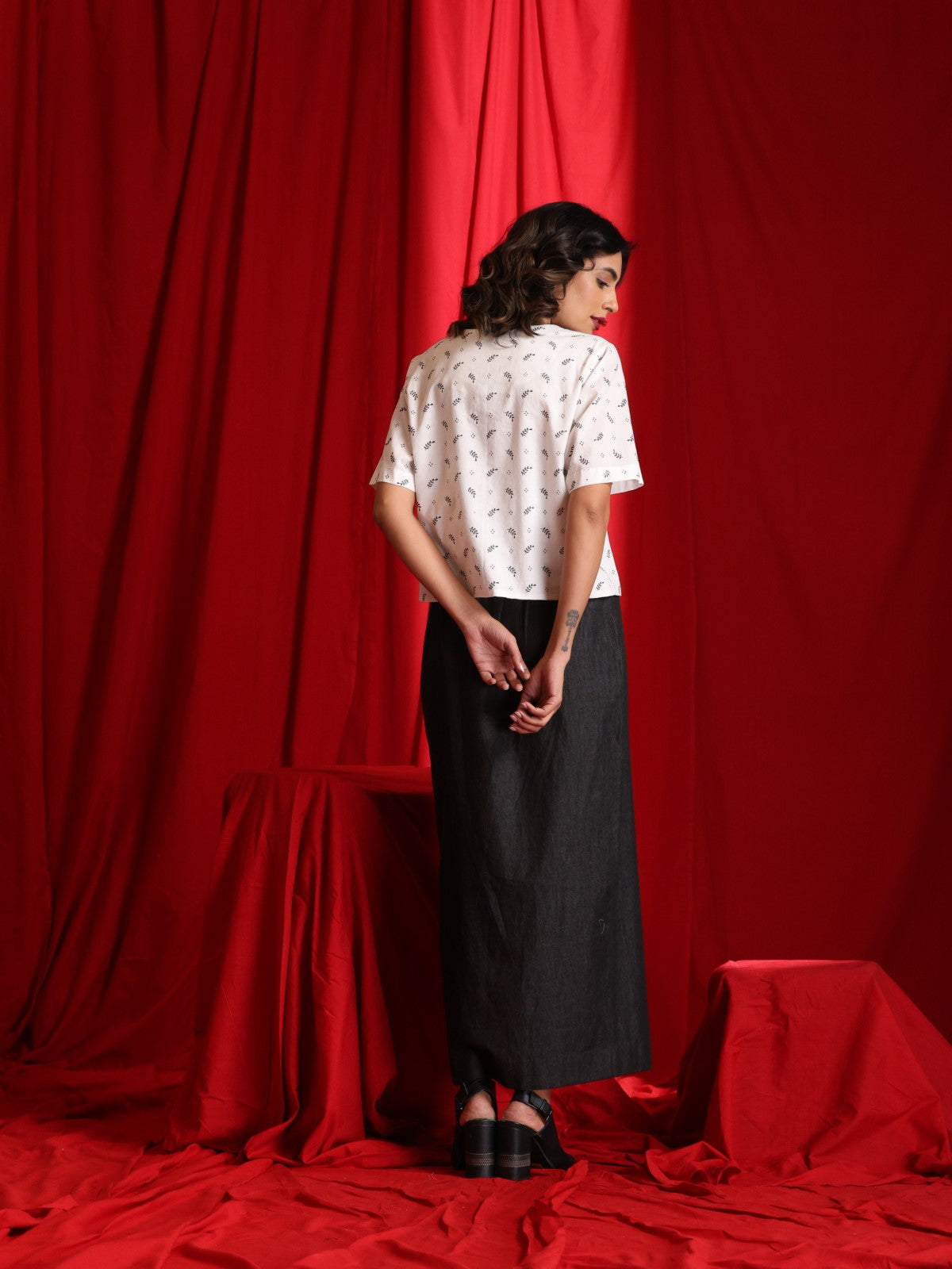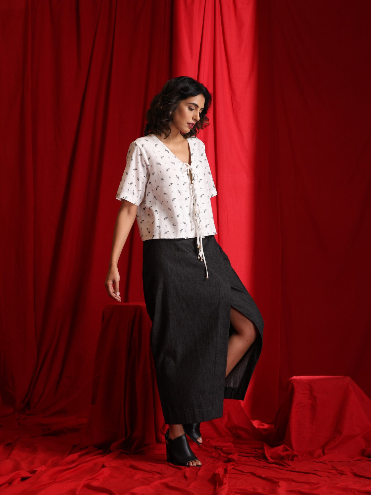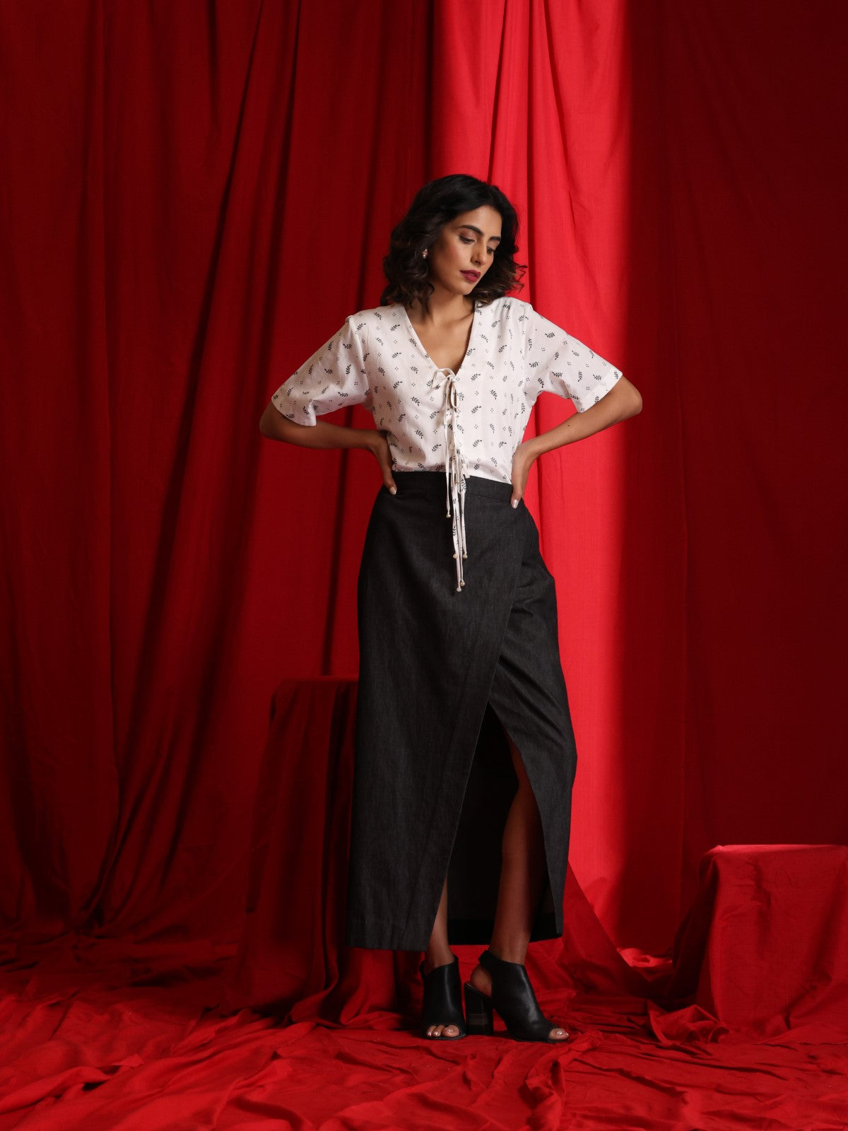 This is the front open top tied with multiple strings at the front which is all the trend and rage currently, The strings are finished with a small pearl button. The top can be worn with all strings opened with a fun inner/vest inside, it can be worn with a few strings closed to give the street chic vibe or with all strings closed for a more comfortable feeling. Pair it with black trousers or with denim shorts or with pleater midi skirt, depending on the occassion.