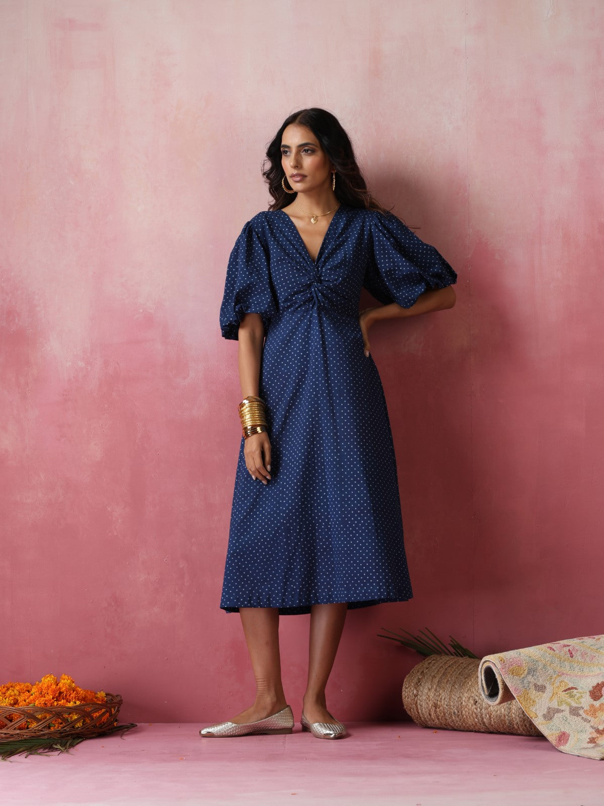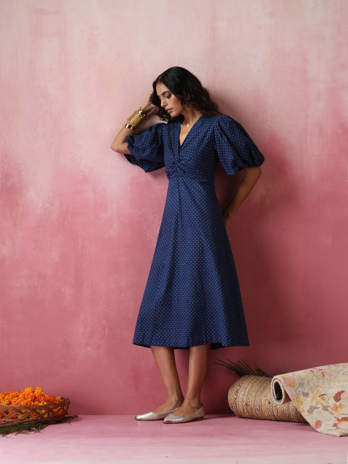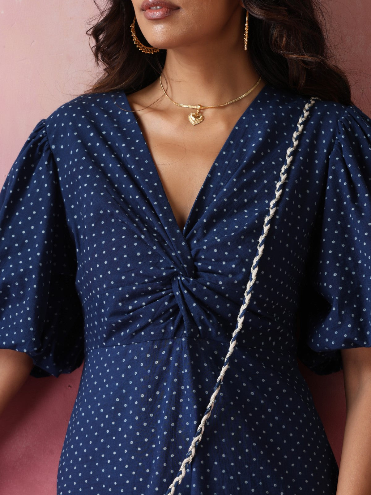 Featuring a fabulous dress crafted in classic polka print . This flowy maxi dress has a V neckline and twisted front yoke. The sleeves are dramatic and looks amazing on wearing. The fall is smooth and flattering and the dress works for vacations and casual hangs.